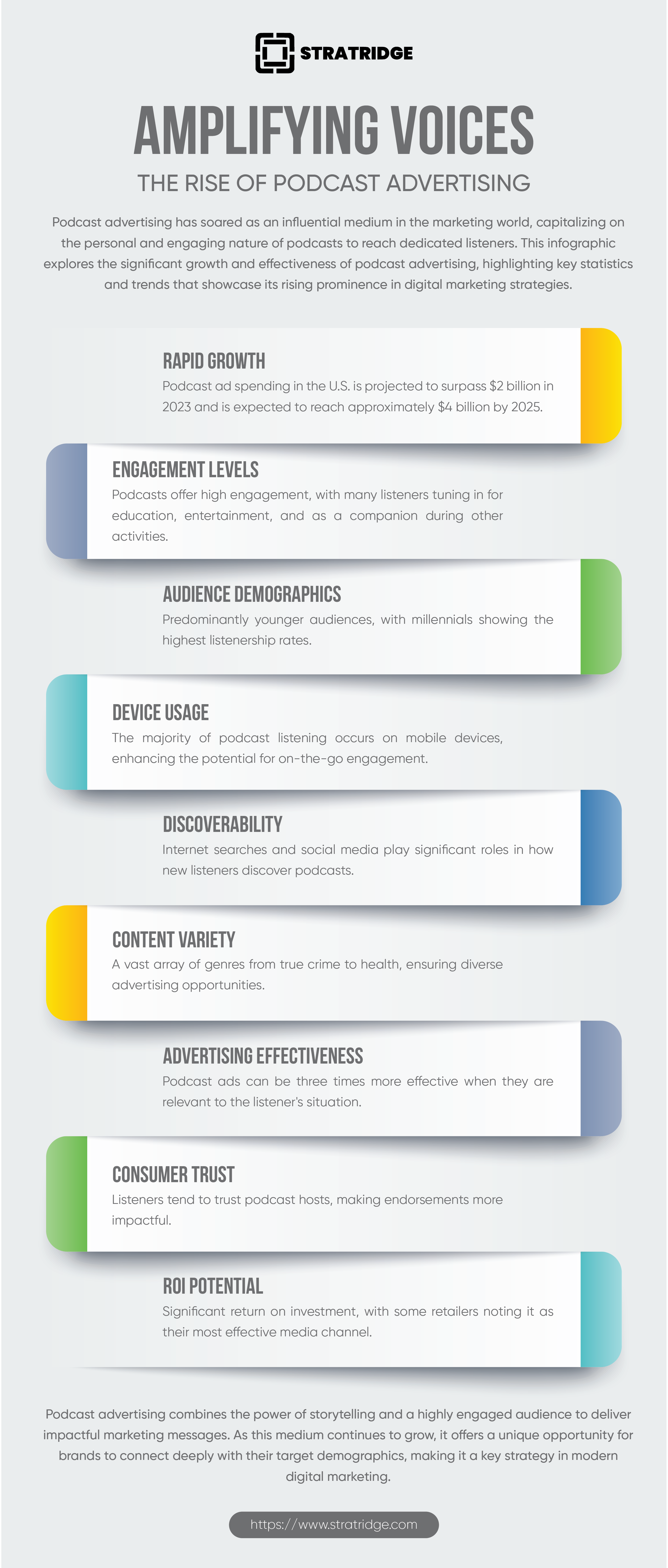 Podcast advertising combines the power of storytelling and a highly engaged audience to deliver impactful marketing messages. As this medium continues to grow, it offers a unique opportunity for brands to connect deeply with their target demographics, making it a key strategy in modern digital marketing.