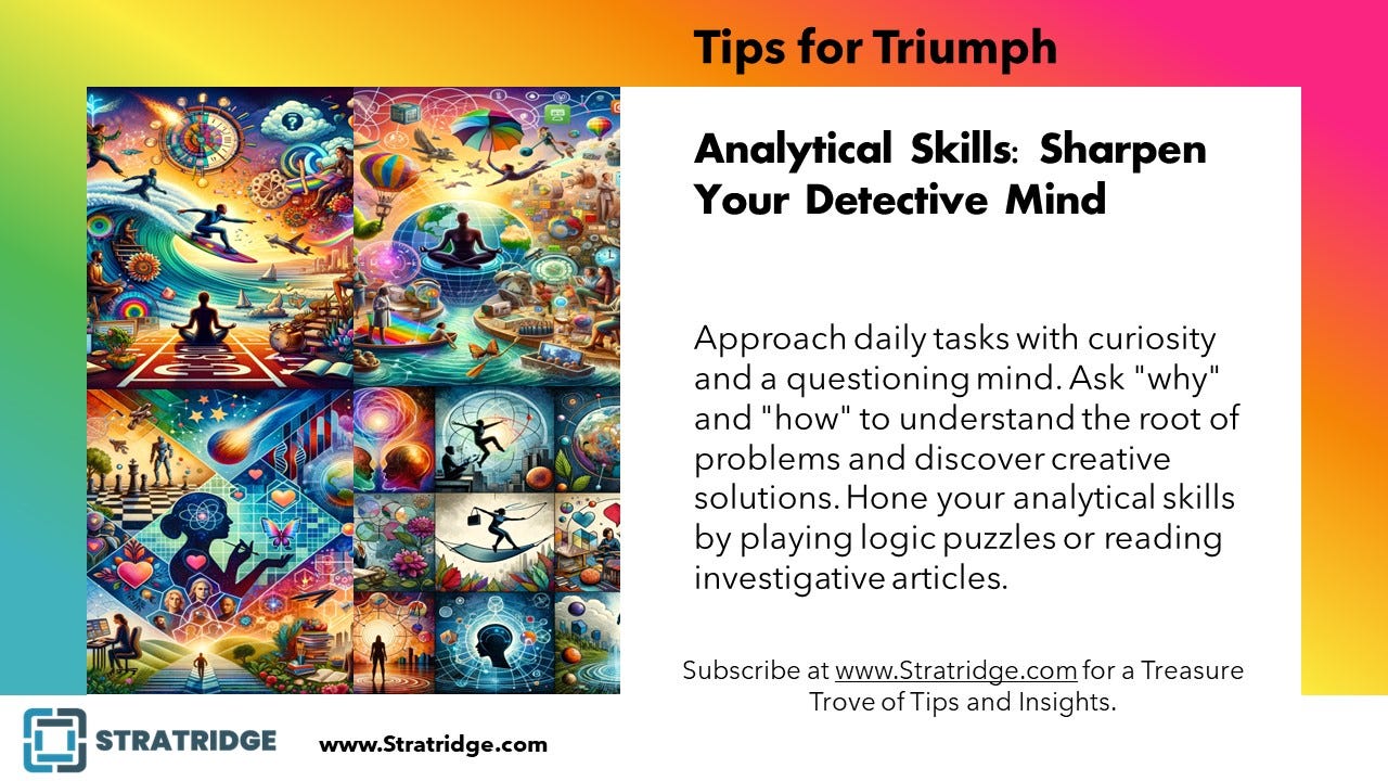 Approach daily tasks with curiosity and a questioning mind. Ask "why" and "how" to understand the root of problems and discover creative solutions. Hone your analytical skills by playing logic puzzles or reading investigative articles.