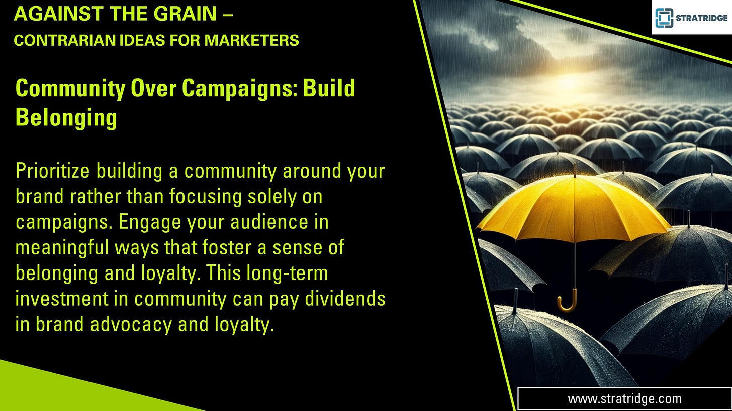 Today, most interactions are primarily "transactions." Consumers are bombarded with endless advertisements and marketing gimmicks. Instead of adding to the burden, a contrarian approach that builds a genuine sense of community around a brand can be remarkably effective. The traditional marketing model, which prioritizes campaigns designed to push products or promotions, often overlooks the profound impact of cultivating a deeper, more meaningful connection with the audience. By prioritizing community over campaigns, brands can foster a sense of belonging and loyalty that enhances consumer engagement and turns customers into long-term advocates.