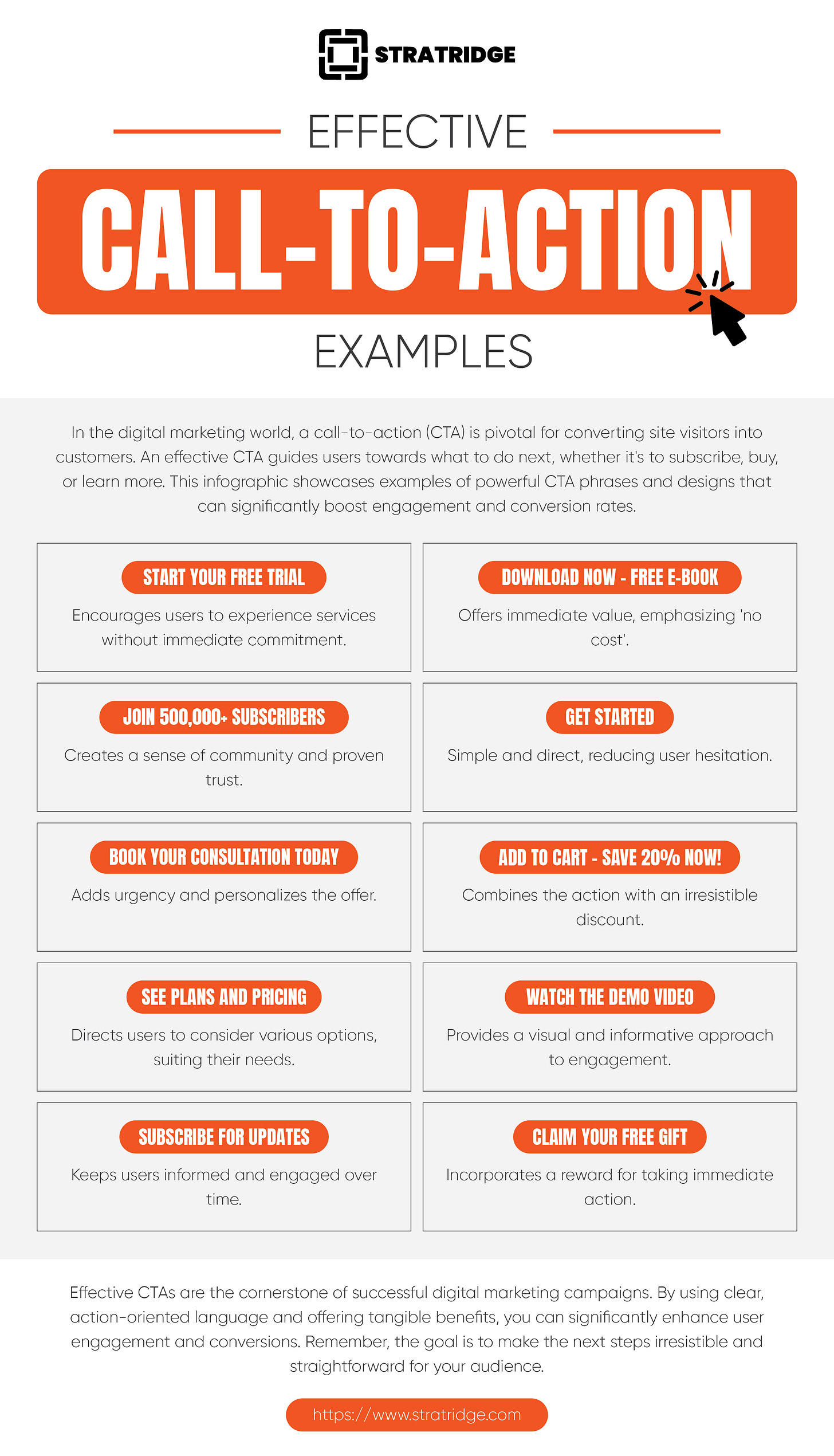 In the digital marketing world, a call-to-action (CTA) is pivotal for converting site visitors into customers. An effective CTA guides users towards what to do next, whether it's to subscribe, buy, or learn more. This infographic showcases examples of powerful CTA phrases and designs that can significantly boost engagement and conversion rates.