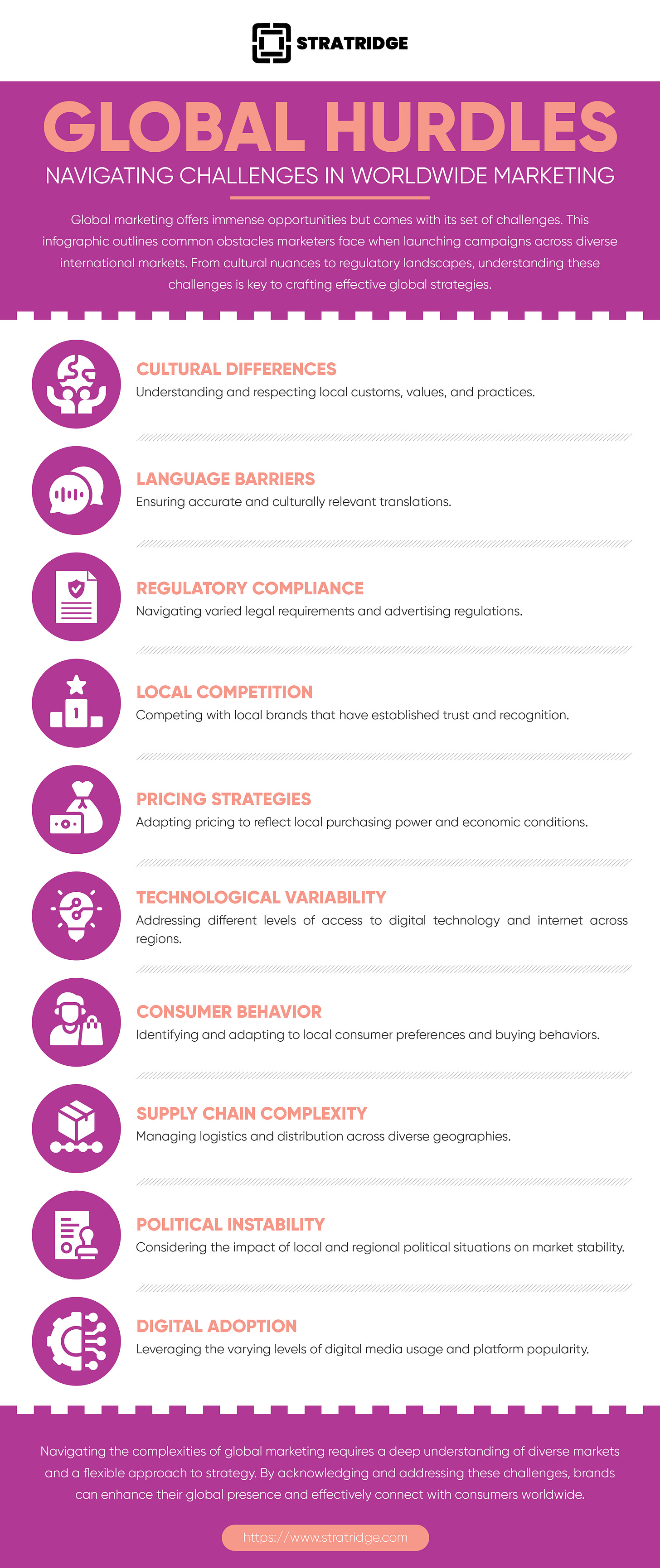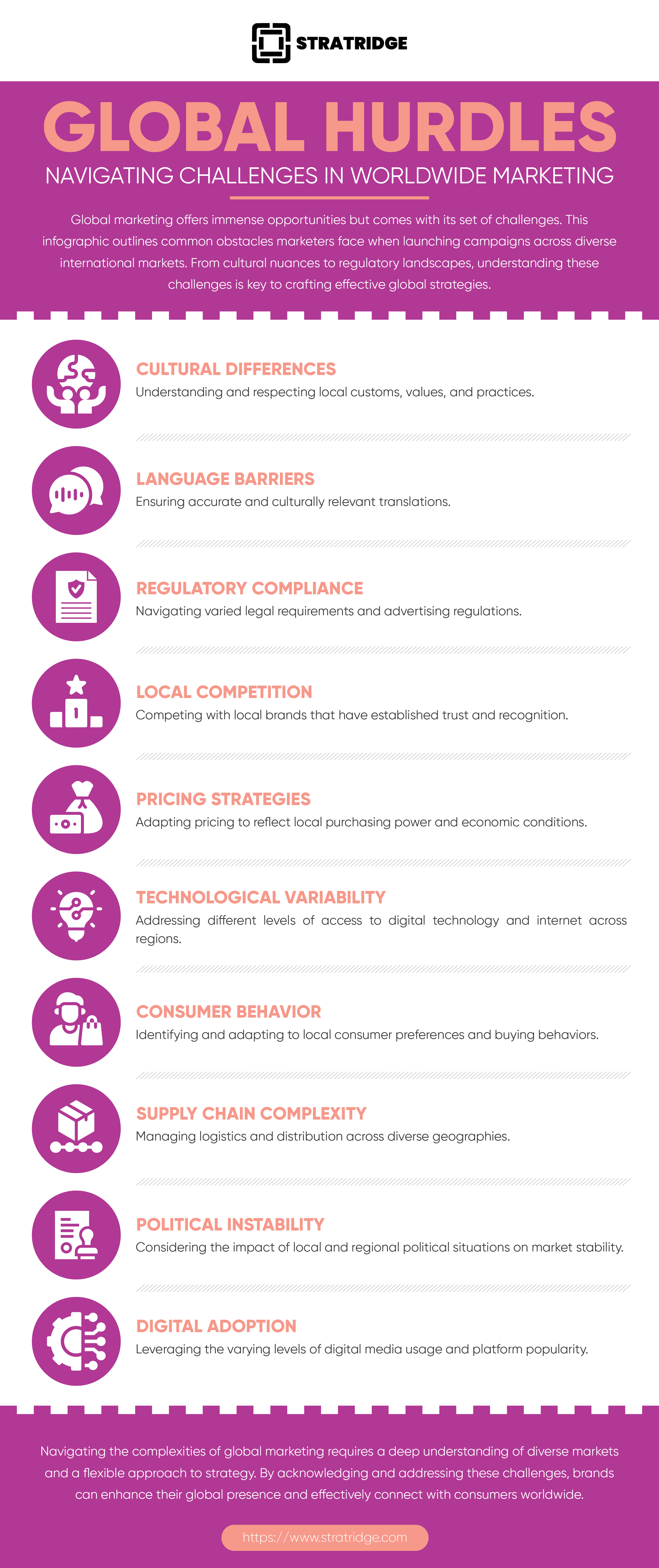Global marketing offers immense opportunities but comes with its set of challenges. This infographic outlines common obstacles marketers face when launching campaigns across diverse international markets. From cultural nuances to regulatory landscapes, understanding these challenges is key to crafting effective global strategies.