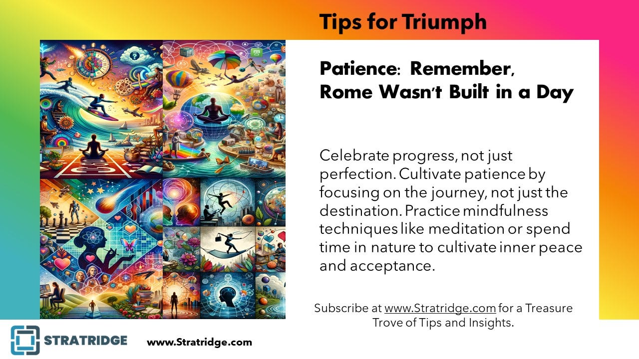 Celebrate progress, not just perfection. Cultivate patience by focusing on the journey, not just the destination. Practice mindfulness techniques like meditation or spend time in nature to cultivate inner peace and acceptance.