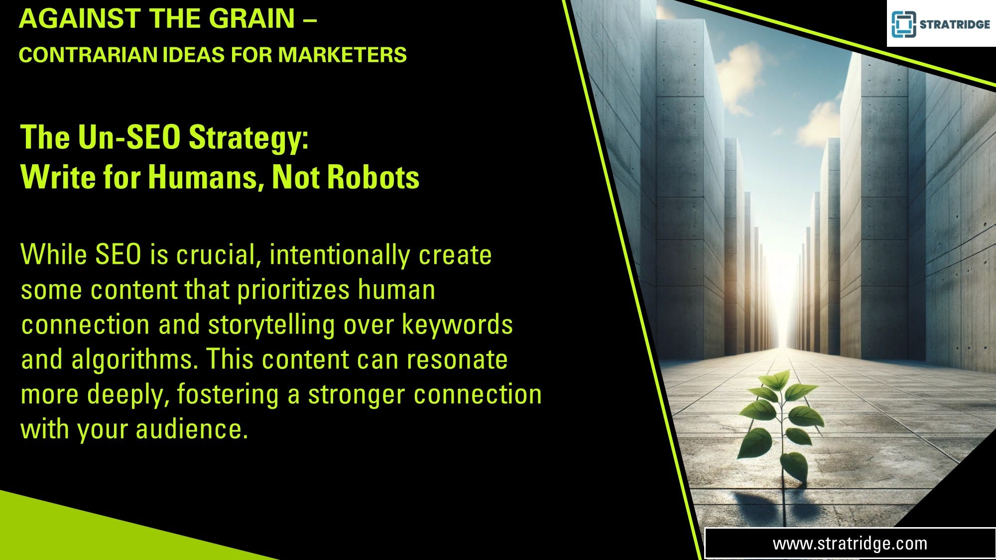 In the digital age, search engine optimization (SEO) has become a cornerstone of online marketing strategies, influencing everything from content creation to website design. However, the emphasis on optimizing content for search engines often results in texts that feel mechanical and impersonal, geared more toward algorithms than human readers. This has led to a contrarian approach in content marketing: the Un-SEO Strategy. This method prioritizes human connection and storytelling over keywords and search engine algorithms, aiming to create content that resonates deeply and fosters a stronger connection with the audience.